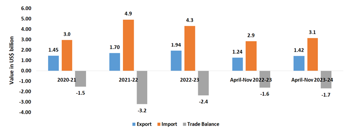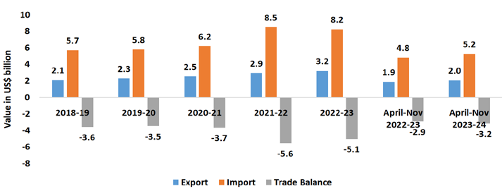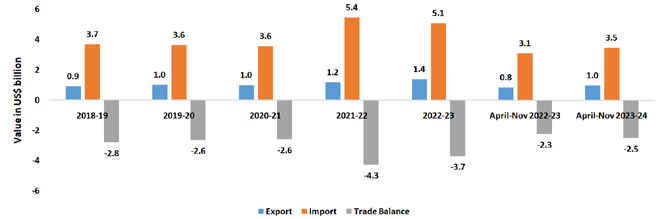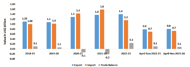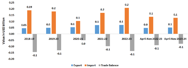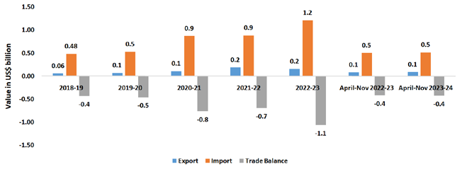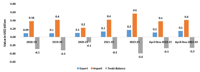 Observations: In this segment, India’s exports in the last five years grew at a much higher rate (6.2 percent) compared to its imports (3.7 percent). While India had a positive trade balance between in 2018-19 and 2019-20, in 2020-21 and 2021-22 India’s trade balance in became negative, while the trade balance once again witnessed positive figures during 2022-23 as well as during the current fiscal April-Nov 2023-24.
