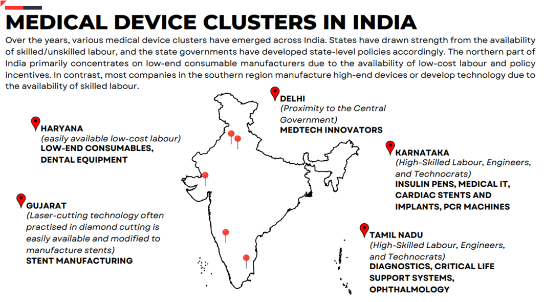 Scenario of Global Clusters: Clusters Medical device firms are many a times operating in clusters. This is necessitated due to the various cross-functional support required by the units, including the presence of hospitals and doctors for conceptualizing and testing and quality raw materials. USA has over ten clusters. Europe too has a number of medical device clusters in Germany Netherlands, France, Italy, Switzerland, etc. India has over ten clusters. Medical devices clusters are also present in Japan, China, South Korea, Brazil, Australia etc.