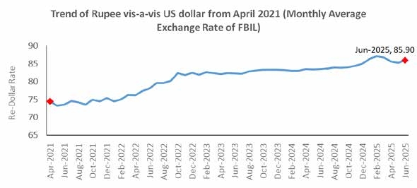 Rupee after two months, depreciated once again both on a monthly as well as yearly basis in June 2025: INR depreciated vis-àvis the US Dollar by 0.83 percent in June 2025 over the previous month as it dropped to below 86 per USD and weakened to USD 86.80. Surge in global crude oil prices following the geo-political tension in West Asia involving USA, strengthening of dollar and a weak domestic equity market pushed rupee down.
