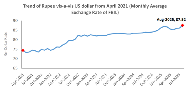 Rupee continued to depreciate both on a monthly as well as yearly basis for the third straight month in August 2025 as INR hit its lowest: INR depreciated vis-à-vis the US Dollar by 1.64percent in July 2025 over the previous month and a much higher 4.31percent on a year-on-year basis. Rupee dropped to below 87 per US Dollar in July that continued in August 2025 andit closed the month at 87.85 per US Dollar (FBIL data). Uncertainty over an India-U.S. trade deal after U.S. President Donald Trump hinted at tariff hike continued to wigh on rupee. Month-end dollar demand from importers and sustained foreign fund outflows also weighed on the Indian local unit.