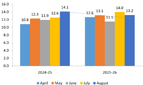 | Aug-2024 | Aug-2025 | Apr - Aug 2024-25 | Apr - Aug 2025-26 | Aug 2025 over Aug 2024 | Apr-Aug 2025 over Apr-Aug 2024 | |